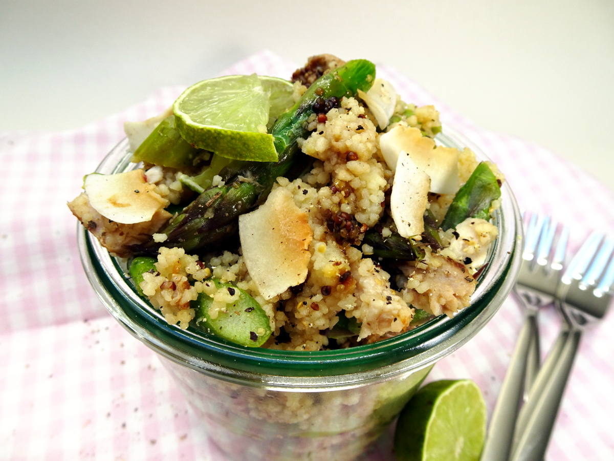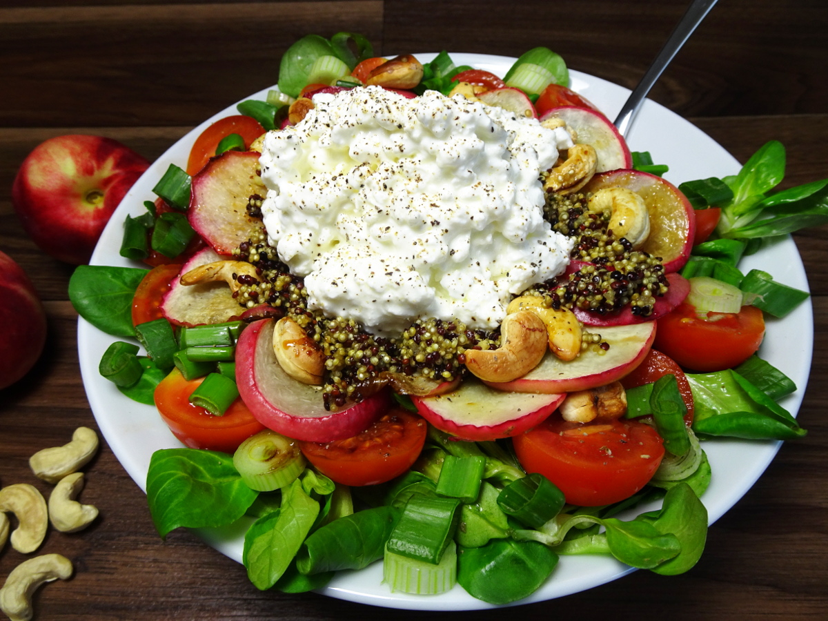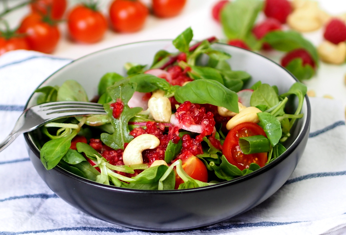 Sommerliche Buddhabowl Salat mit Himbeerdressing Flammkuchen Couscous Bowl